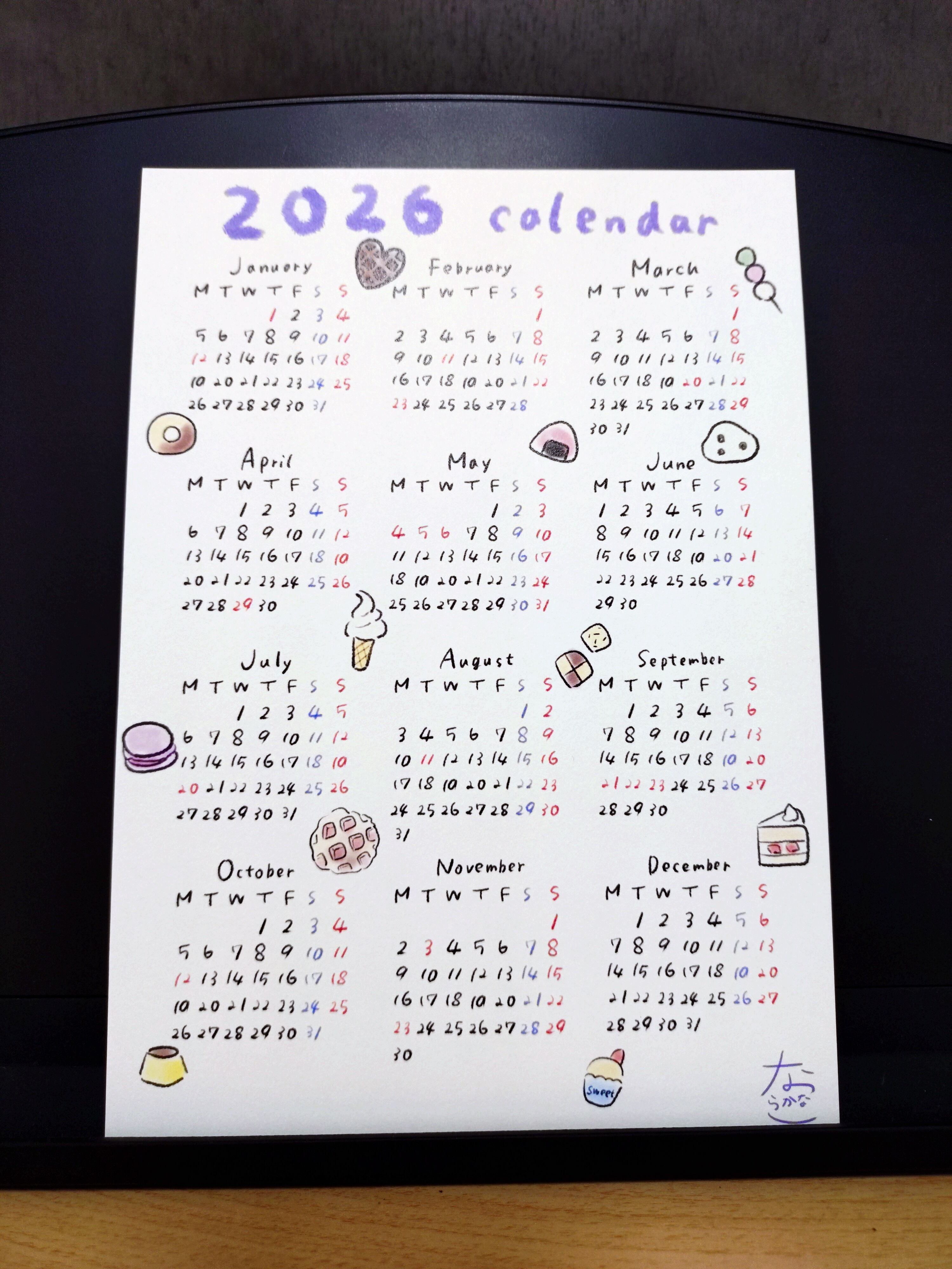 手書きスイーツがたくさん散りばめられた、2026年のカレンダーです☆